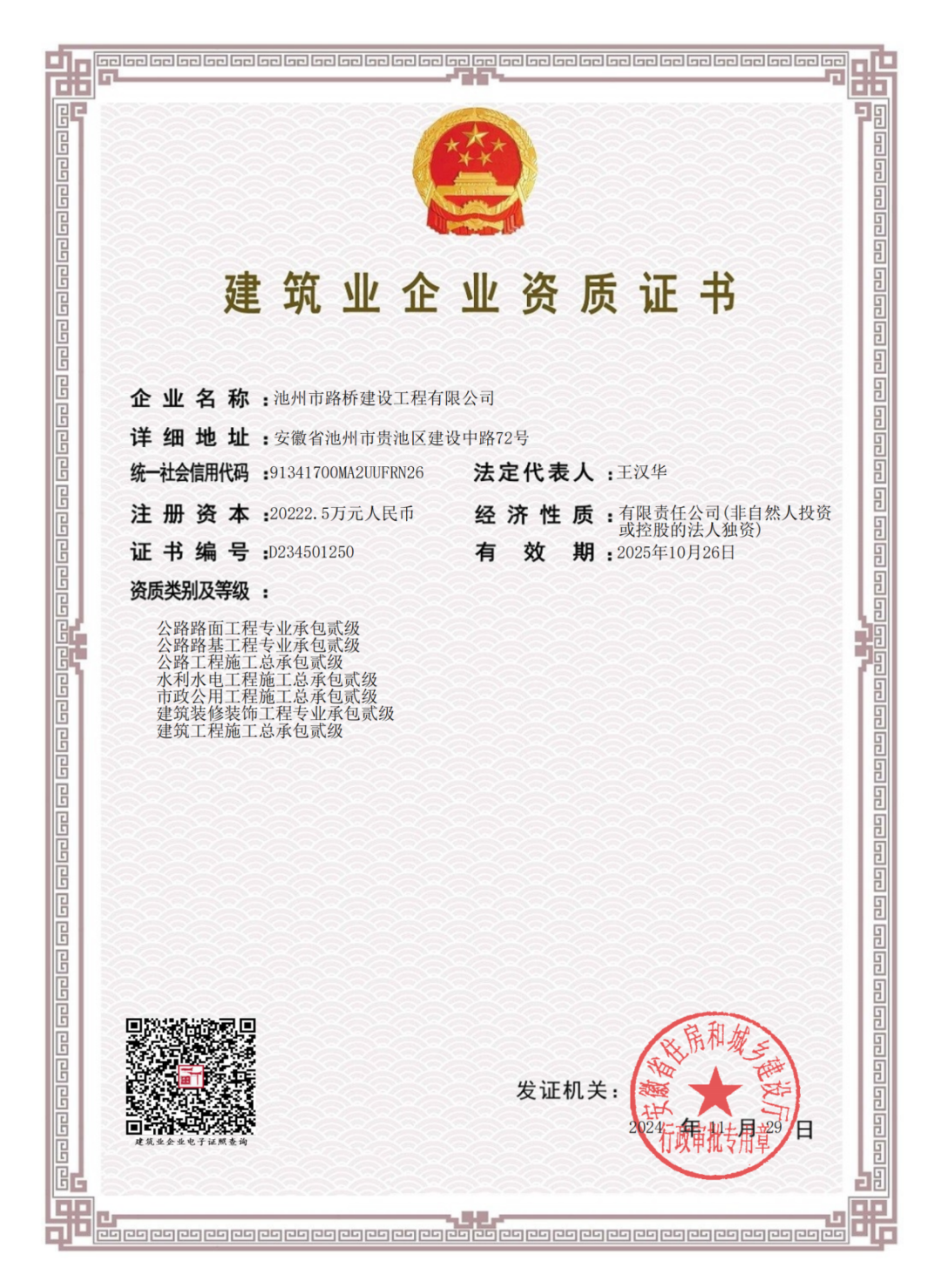 公司發展四年多,已成功取得建筑工程施工總承包貳級、公路工程施工總承包貳級、市政公用工程施工總承包貳級、建筑裝修裝飾工程專業承包貳級、公路路面工程專業承包貳級、公路路基工程專業承包貳級等資質。如今,獲批水利水電工程施工總承包貳級資質,為公司業務板塊拓展了更高更廣的發展空間。