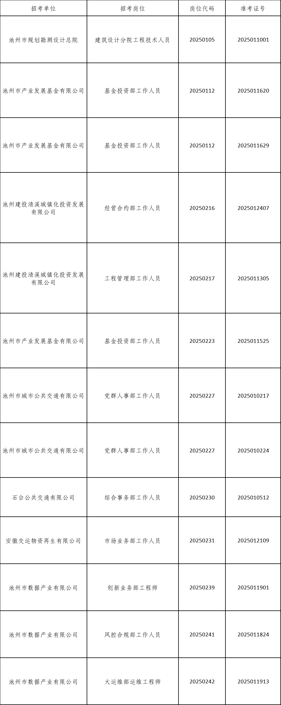 根據《池州市投資控股集團2025年公開招聘工作人員公告》要求,由于入圍現場資格復審的考生中有部分人員自動放棄或不合格產生了人員空缺,現按《公告》要求,在報考同崗位的考生中按筆試成績從高分到低分的順序依次遞補,成績出現并列者一并進入資格復審,現將入圍遞補資格復審情況公告如下: