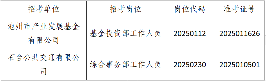 根據《池州市投資控股集團2025年公開招聘工作人員公告》要求,由于入圍現場資格復審的考生中有部分人員自動放棄或不合格產生了人員空缺,現按《公告》要求,在報考同崗位的考生中按筆試成績從高分到低分的順序依次遞補,成績出現并列者一并進入資格復審,現將入圍遞補資格復審情況公告如下:
