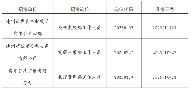 根據《池州市投資控股集團2025年公開招聘工作人員公告》要求,由于入圍體檢的考生中有部分人員自動放棄或不合格產生了人員空缺。現按《公告》要求,視崗位情況進行遞補。現將入圍遞補體檢情況公告如下: