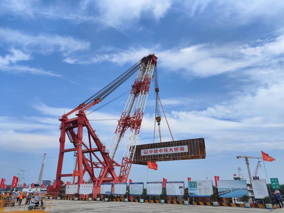 據悉,南主塔墩(4號墩)圍堰采用雙壁鋼套箱結構,總高29米,總重約5558.32噸,共分為四節吊裝,本次吊裝安裝完成的是底節圍堰,平面尺寸為80.2米×52.2米,高9米,占地面積相當于10個標準籃球場,高度相當于3層樓房。其共分為4塊運輸和安裝,單塊重量高達226.2噸。鋼圍堰在工廠制作完成后,通過自航式甲板貨船經320公里的水上運輸,到達指定橋位吊裝下放。