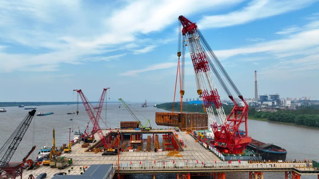 大橋按照“公路+城際鐵路+城市軌道交通”合并過江的標準建設。上層作為寧樅高速公路的過江通道,按雙向6車道布設,設計時速100公里;下層承載兩線合池城際鐵路,設計時速250公里;預留兩線池銅市域鐵路,設計時速160公里。池州長江公鐵大橋共設計有 42 個橋墩,其中3號、4號墩為主塔墩,均位于離岸長江水域。7月26日,南主塔墩(4號墩)基77根樁基完成,本次下放的首節鋼圍堰為樁基上部銜接部分。